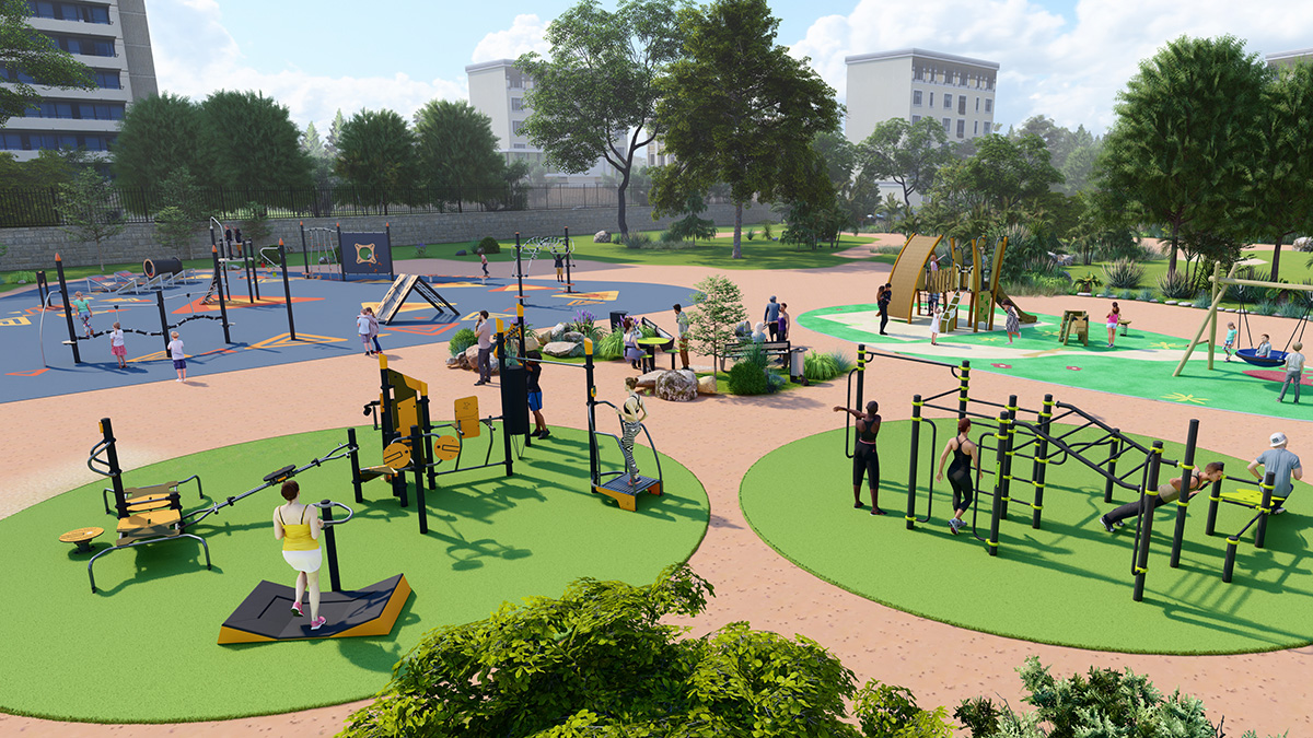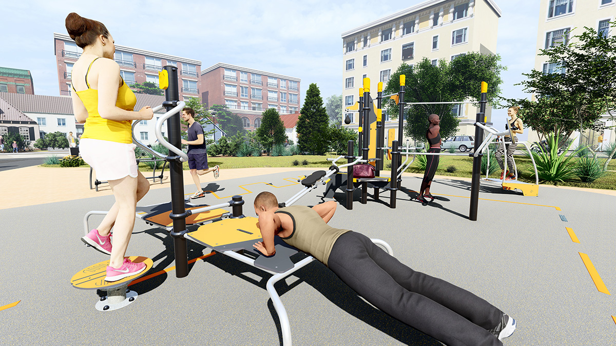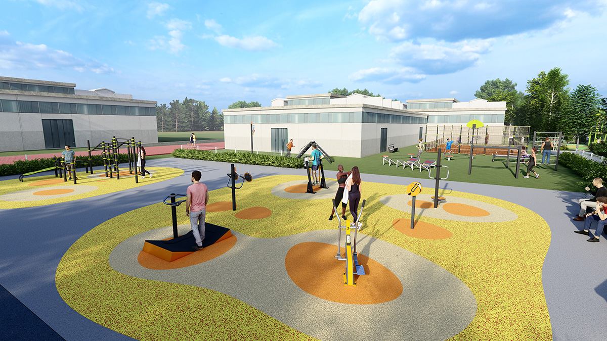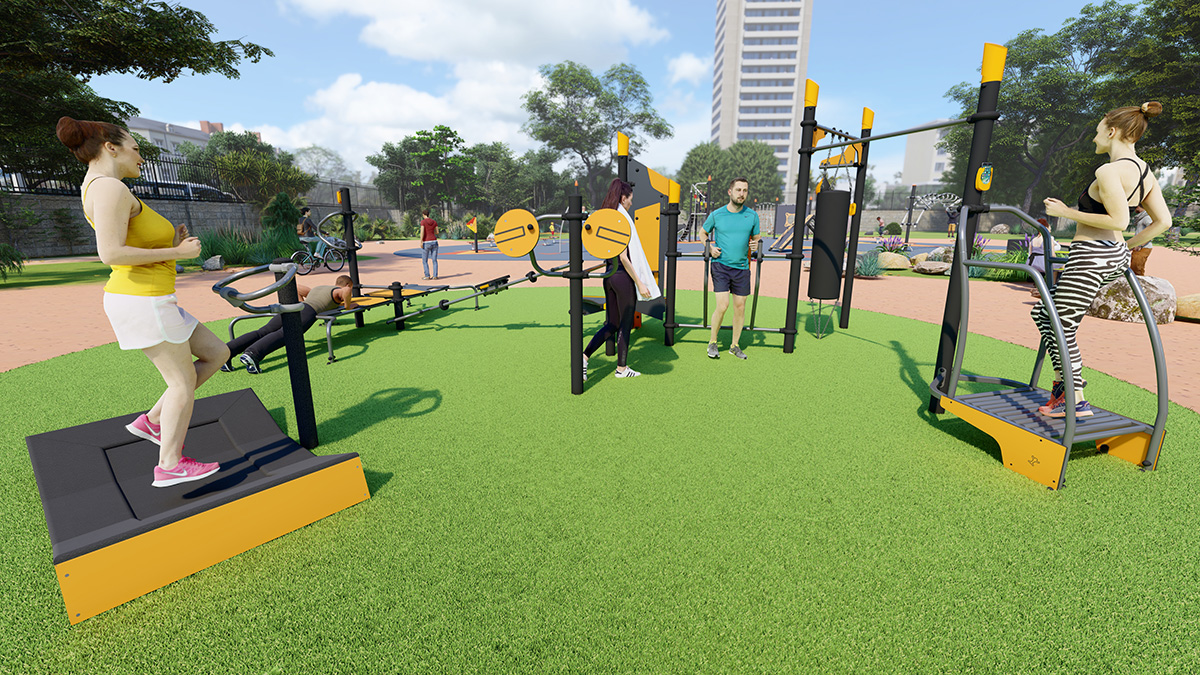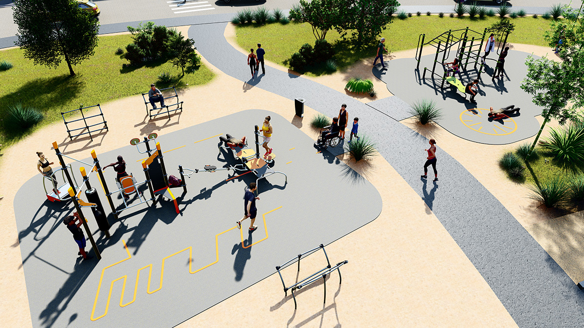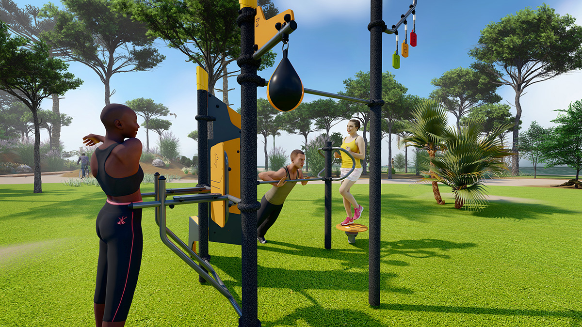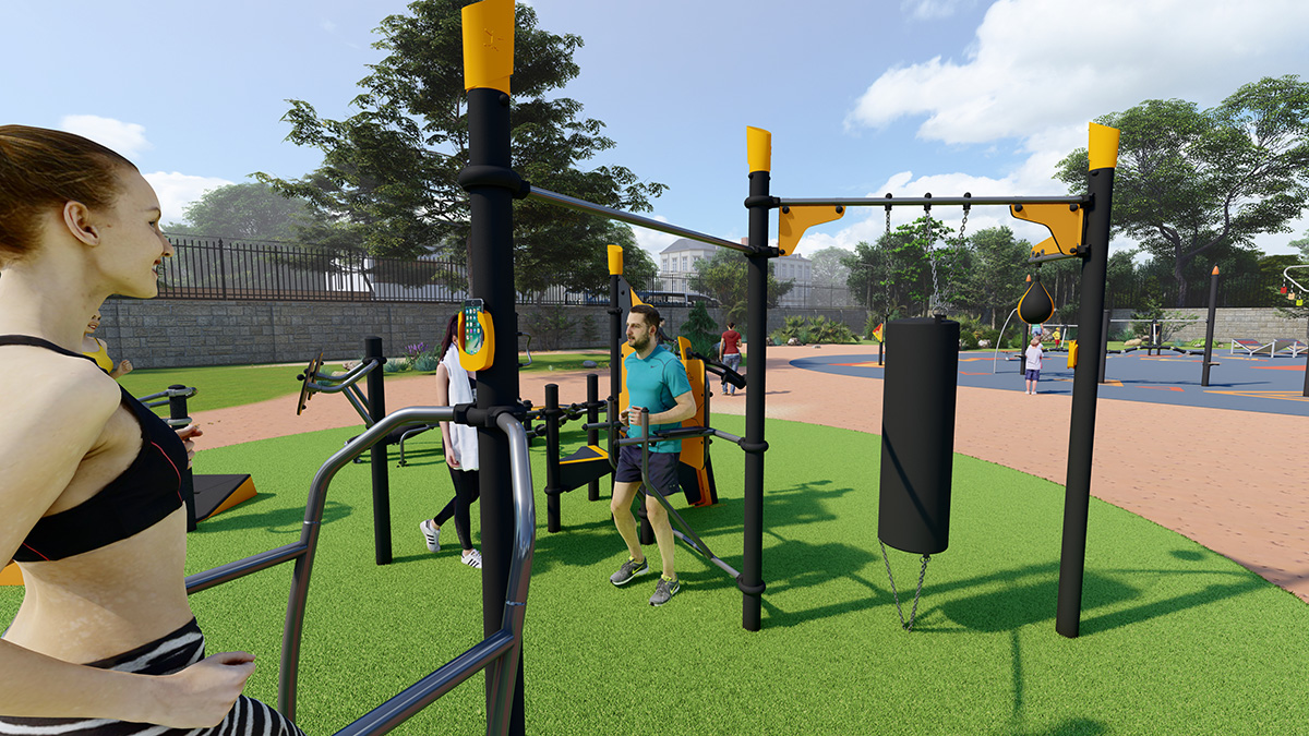 The space, which consists of a Street Workout structure, fitness equipment and outdoor furniture, encourages socialising around mixed, intergenerational