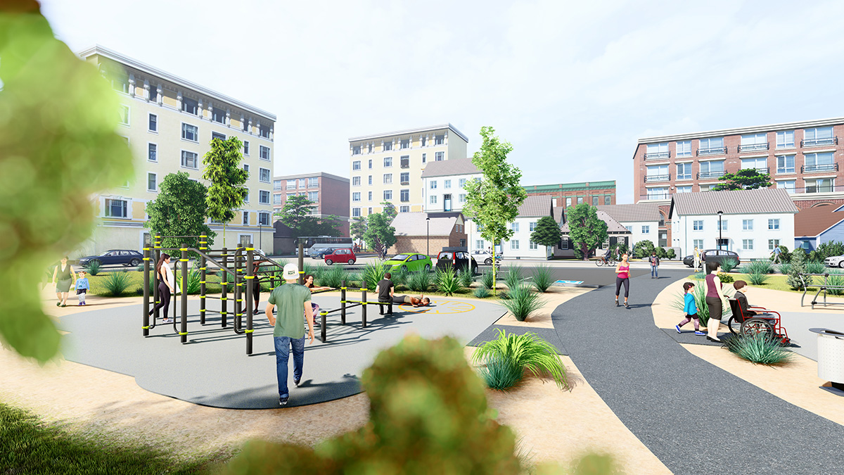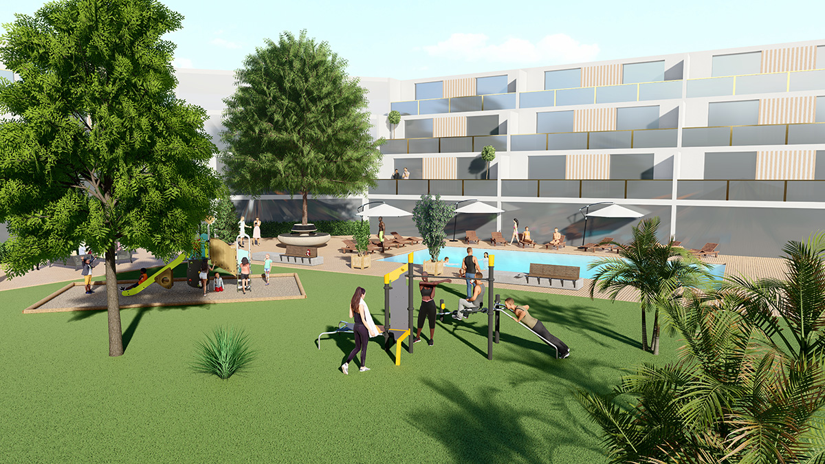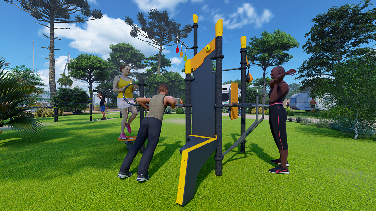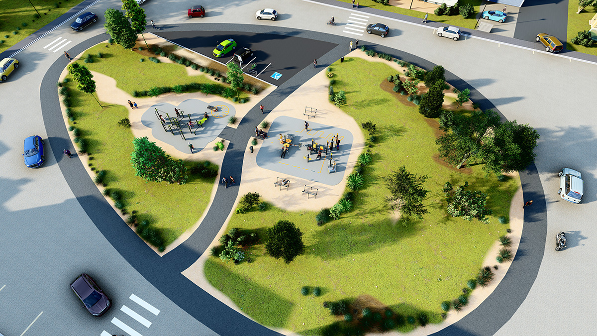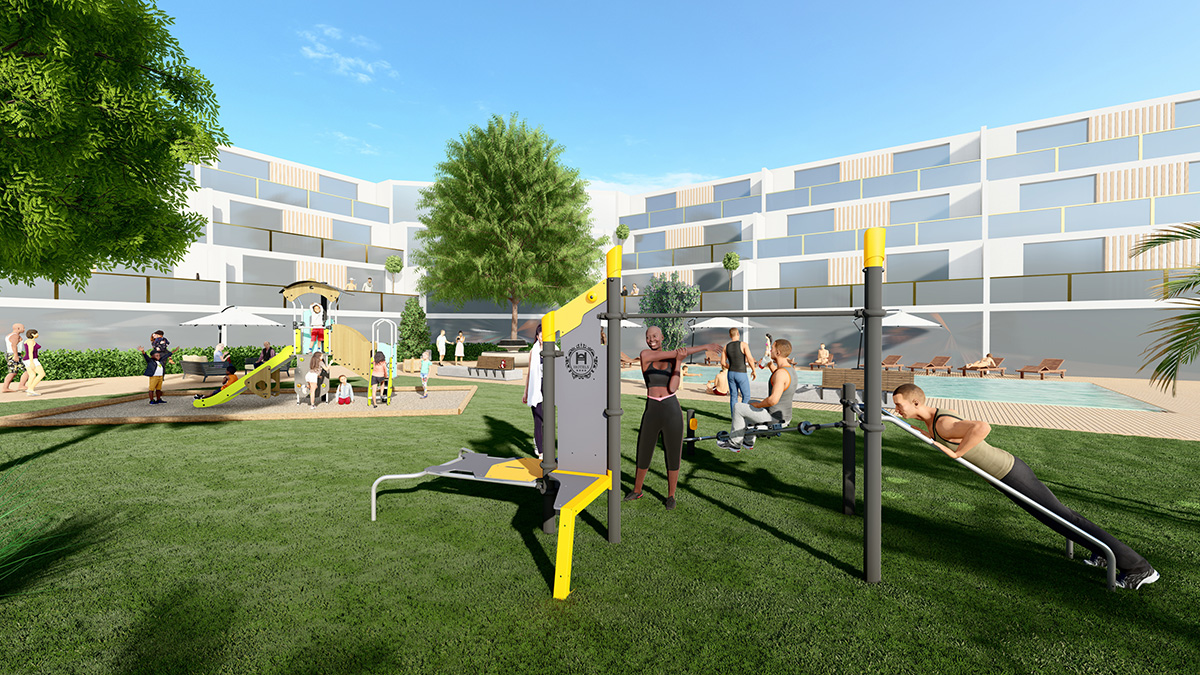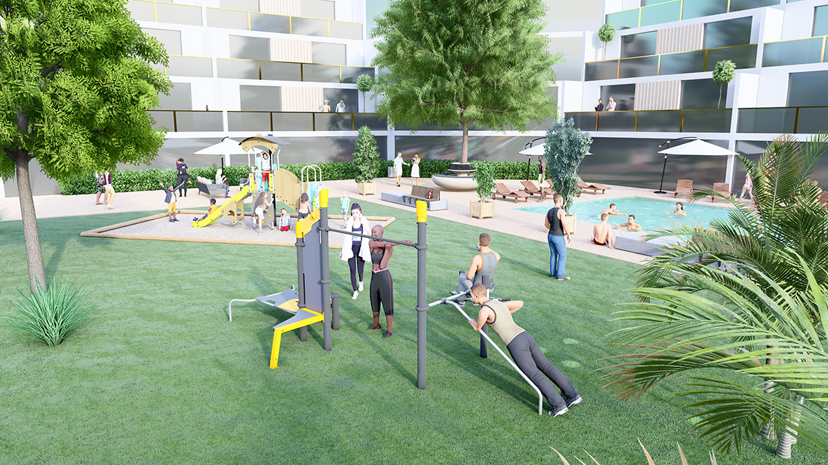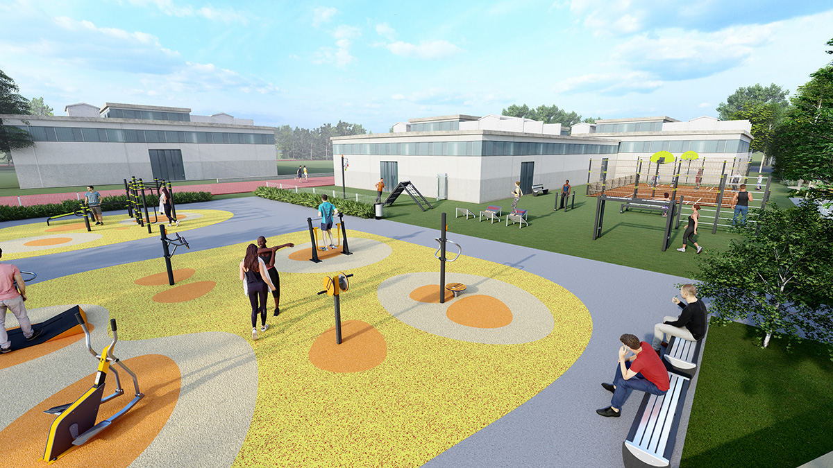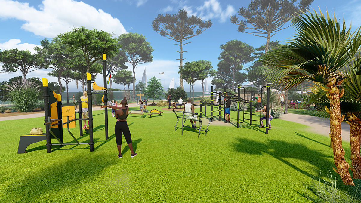 The space, which consists of a Street Workout structure, fitness equipment and outdoor furniture, encourages socialising around mixed, intergenerational