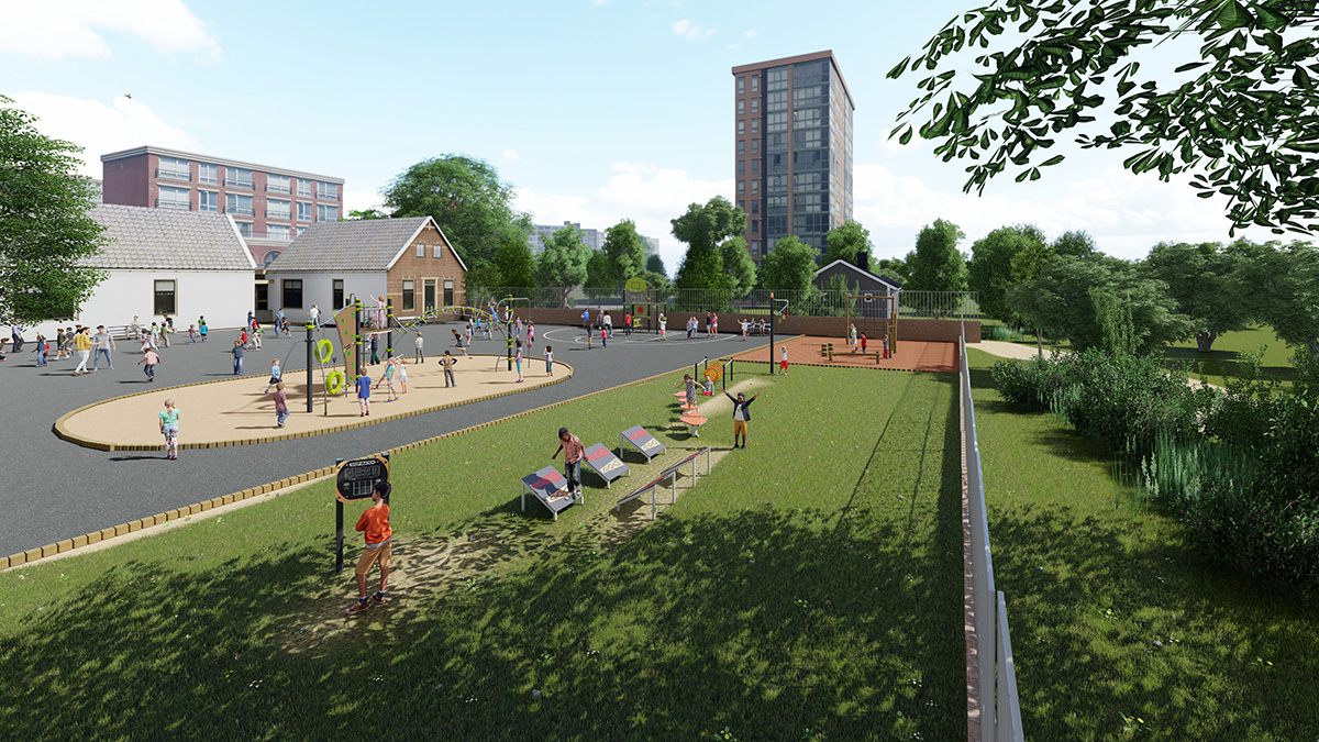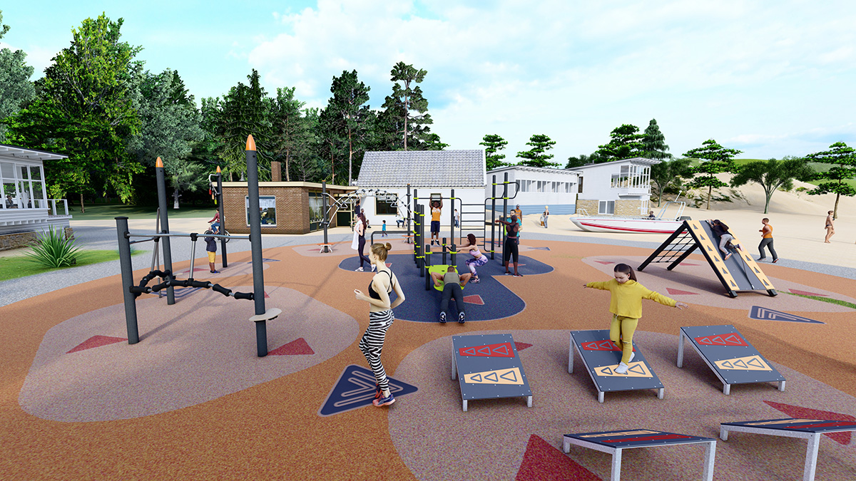 The space is structured around numerous fun-sport activity hubs subdivided by age group.