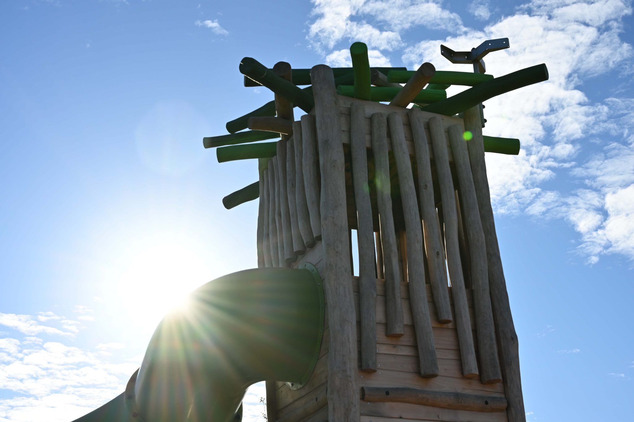 The main attractions are two multi-play bird’s nest towers, featuring green elements wrapped around the top to emulate a nest. One tower connects to a unit with cylindrical tunnels and a slide, while the second features a spiral slide that winds to the ground.