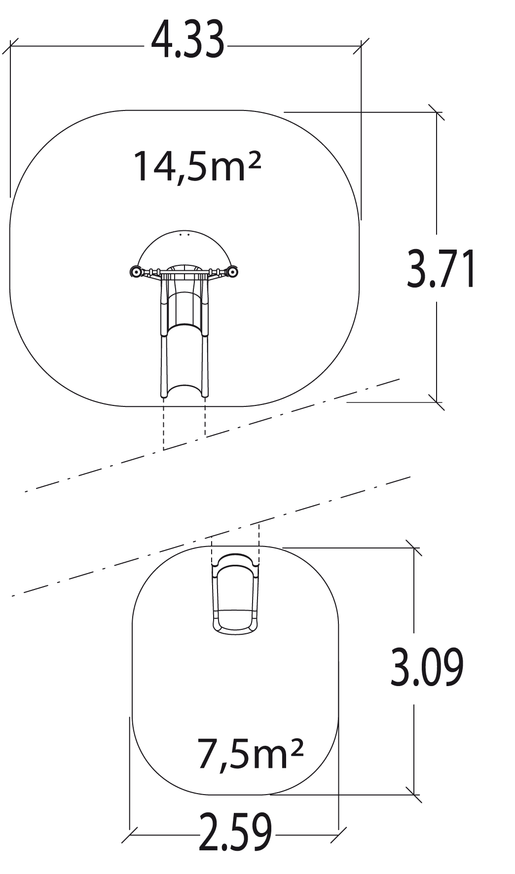 The size of the module is: 3.60 m length, 2.05 m width, 3.30 m. high. The free fall height (FFH) is 1.00 m.