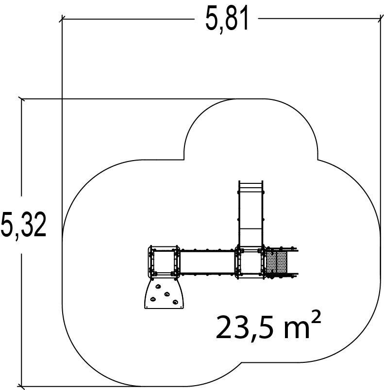 The size of the module is: 2.81 m length, 2.32 m width, 2.06 m. high. The free fall height (FFH) is 1.00 m.