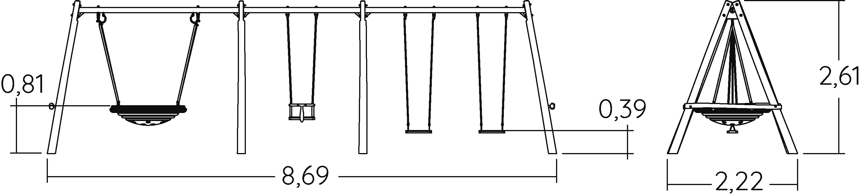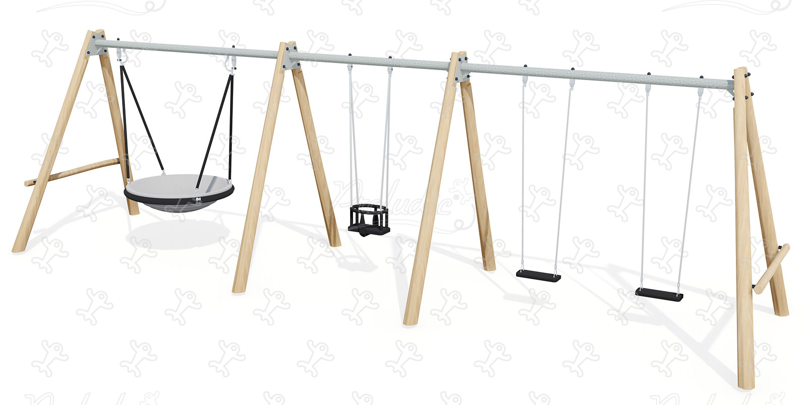 Robinia swing set with pod seat - 2 flat seats and 1 cradle seat - J447-G
