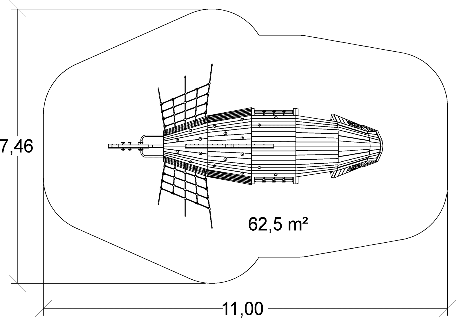 The size of the module is: 7.47 m length, 4.47 m width, 2.80 m. high. The free fall height (FFH) is 2.20 m.