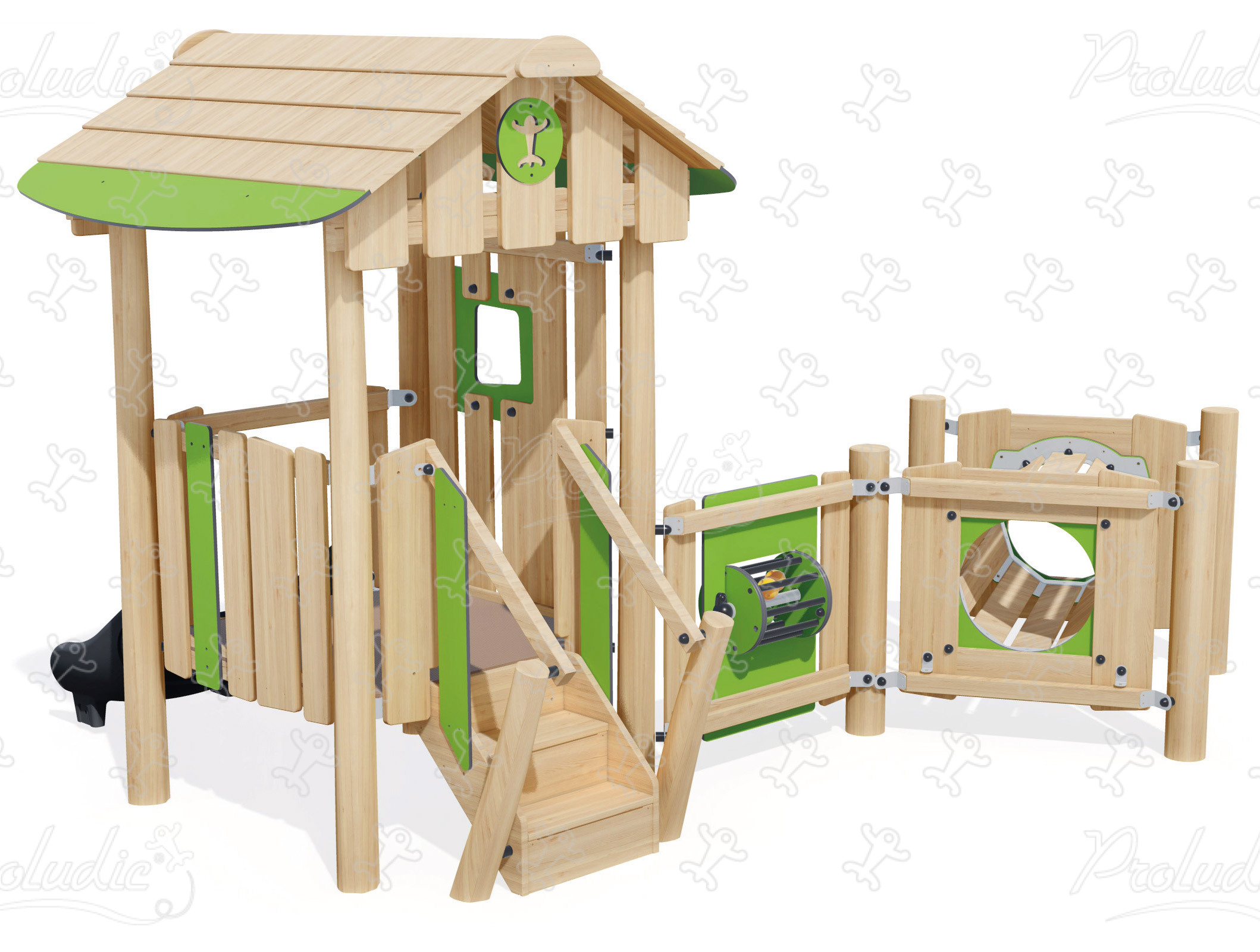 Wooden play structure for young children with slide, cabin, tunnel and musical wheel - J49252®