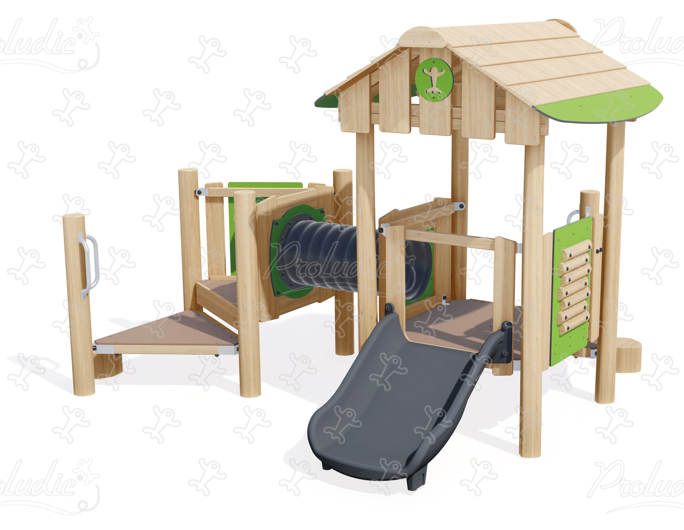 Wooden play structure for young children with slide, cabin, tunnel and sensory panel - J49253®