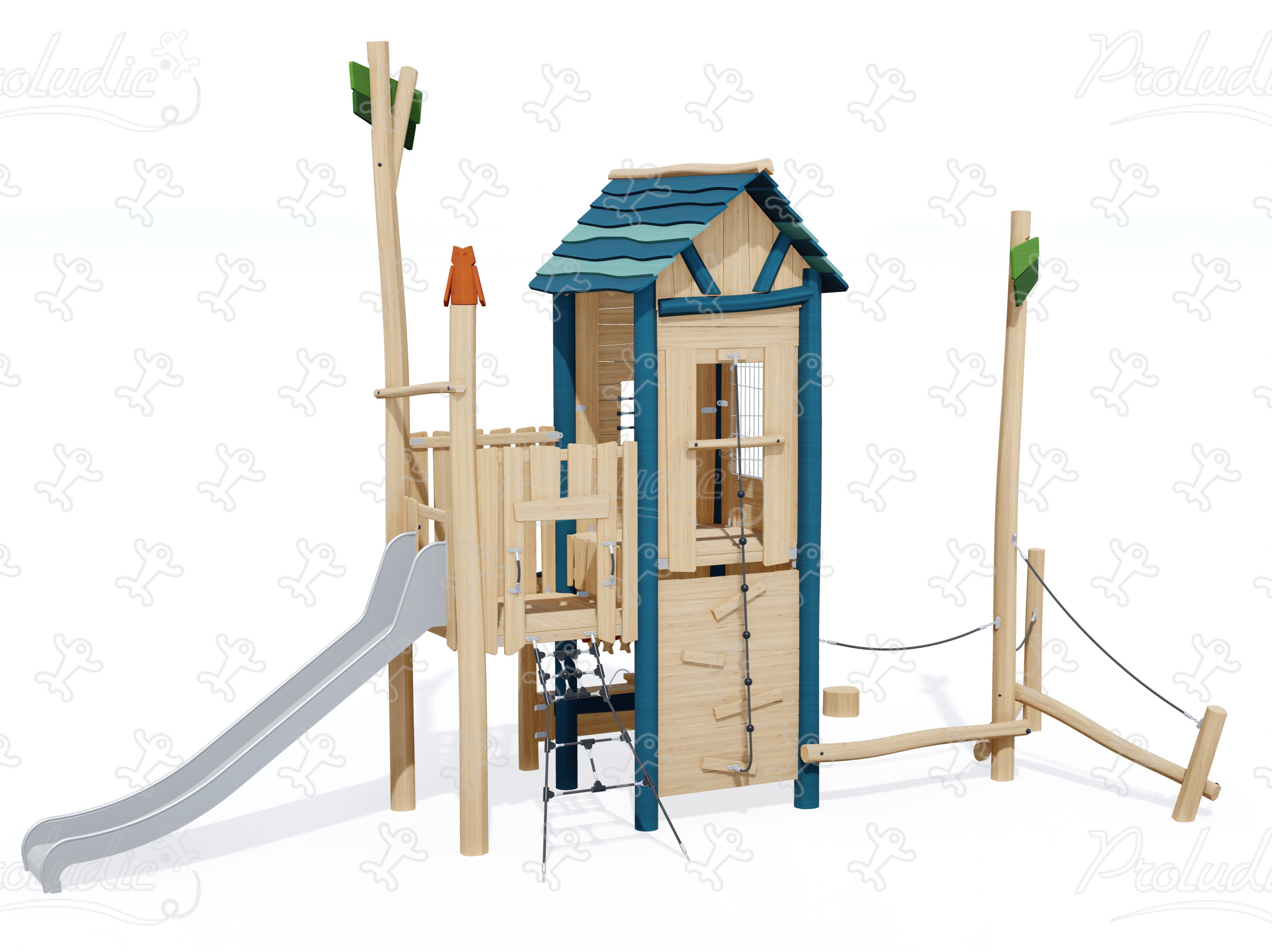 Little Hut - Wooden playground equipment with manipulative play, balancing trail, tower, and slide - J49305®