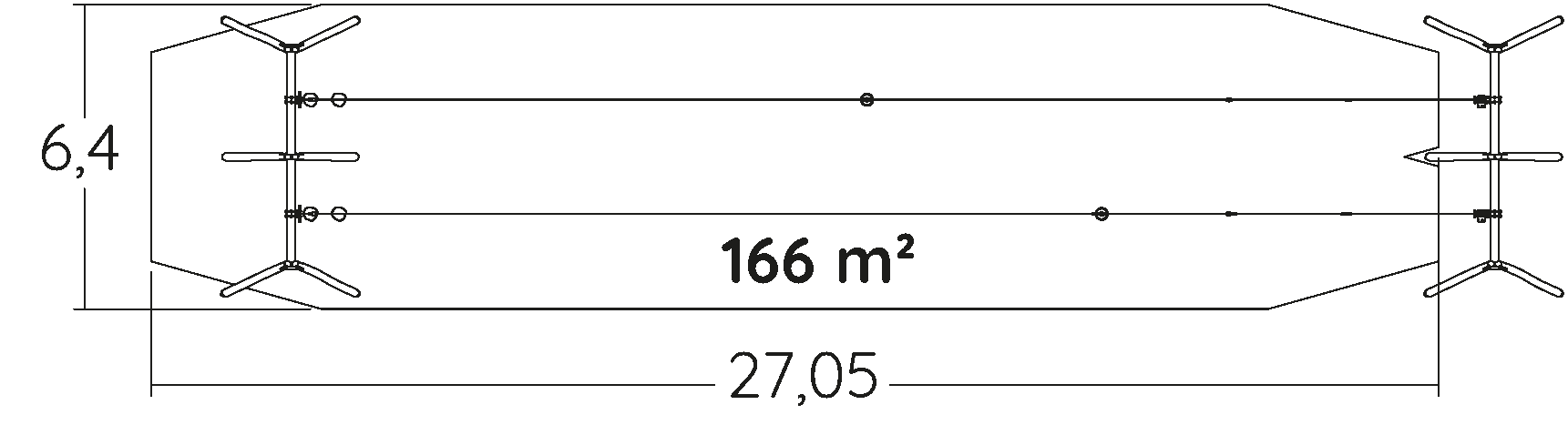 The size of the module is: 28.21 m length, 5.90 m width, 3.53 m. high. The free fall height (FFH) is 1.00 m.