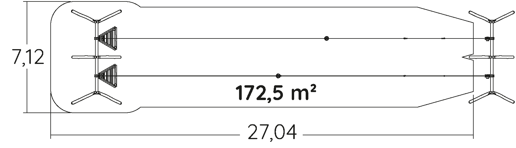 The size of the module is: 28.35 m length, 6.04 m width, 3.93 m. high. The free fall height (FFH) is 1.40 m.