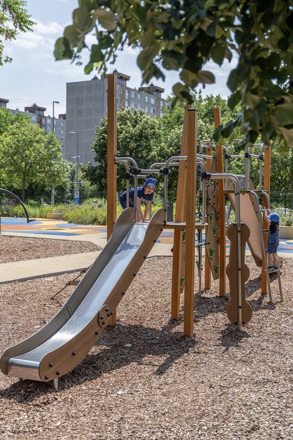 Multiplay equipment with climbing activities and slide in timber-look colour, 23 users - J5614-C®