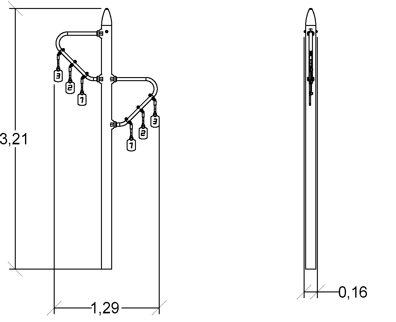 The size of the module is: 1.29 m length, 0.12 m width, 3.21 m. high. The free fall height (FFH) is 0.60 m.